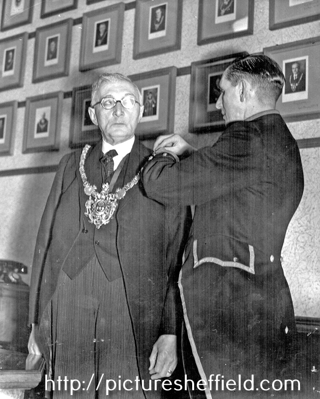 | City Council in session, before a gallery of former Mayors. Mace bearer, Henry Procter (in 31 years he has never missed a Council meeting) adjusts the chain of office for the Lord Mayor, Councillor E.S. Graham, JP. | |