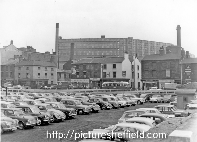 | Car park and shops, Broad Street, Park Hill Flats in background, buildings include (left-right), No 34, Industry Inn, No 32, William Henry Benson and No 28, Plough Inn | |