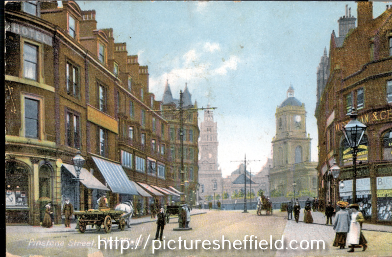 | Pinstone Street from junction with Charles Street, Nos. 84 and 86 Athol Hotel, Nos. 78 and 80 Leonard Beswick, stationer | |