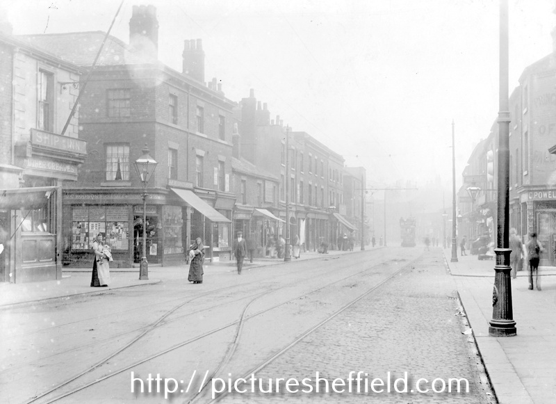 | Nos. 312, Ship Inn, 310 J. C. Hodson, wholesalers and other businesses (left) and No. 325, Prince of Wales, licensee, C. Powell (right), Shalesmoor, showing the junctions with Dunfields (left) and Matthew Street (left) around 1900-1902 | |