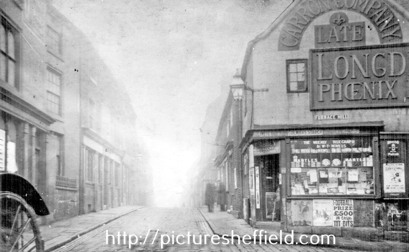 | No. 60 Mrs Eliza Abbey, newsagent (right), 59/63, Farmyard Vaults public house and 65/67 The Old Hussar public house (left), Scotland Street and the junction with Furnace Hill, showing the sign for Carron Company, late Longden and Co., iron founders | |