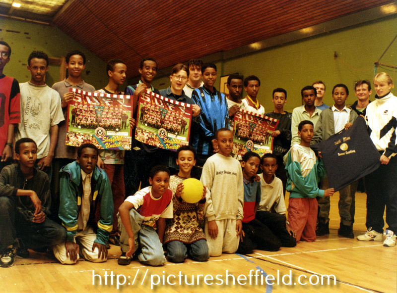 | Roger Nilsen (extreme right) of Sheffield United with a group of Somali youths taking part in a week long coaching scheme organised by the Youth Service, Community Recreation and Sheffield United football club at Y.M.C.A. Sports Hall | |
