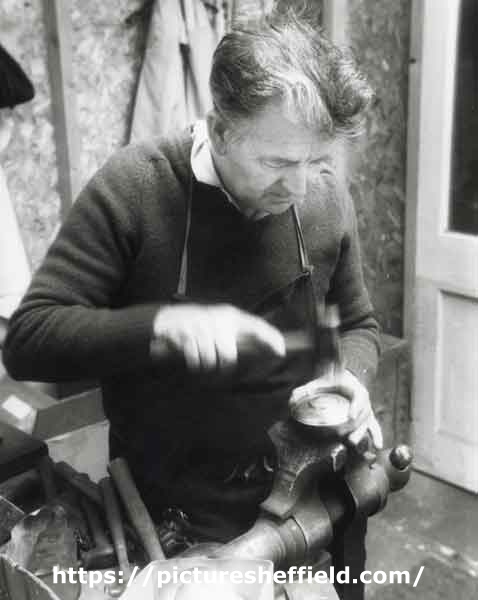 | Derek Hinchsliffe, flat hammerman at Draper and Lamb, silversmiths, No.2 Newton Lane | |