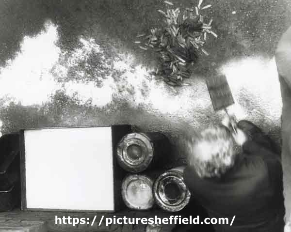 | Ken Croft, hardener and temperer, cooling balades in his Beehive Works workshop, Milton Street | |