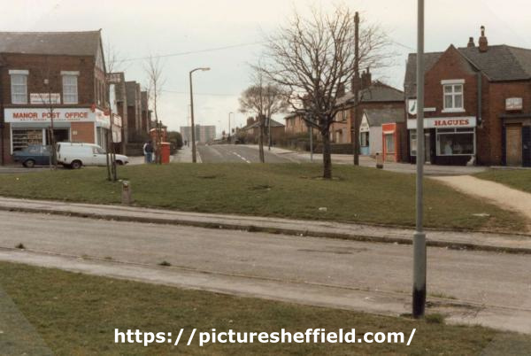 | Fairleigh showing (left) No. 129a Manor post office at the junction with (centre) Wulfric Road and (right) No. 131 Hagues | |