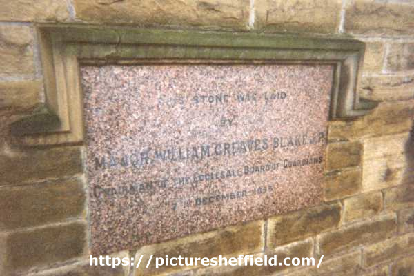 Foundation stone reads: This stone was laid by Major William Greaves Blake JP, chairman of the Ecclesall Board of Guardians, 7th December 1895. |