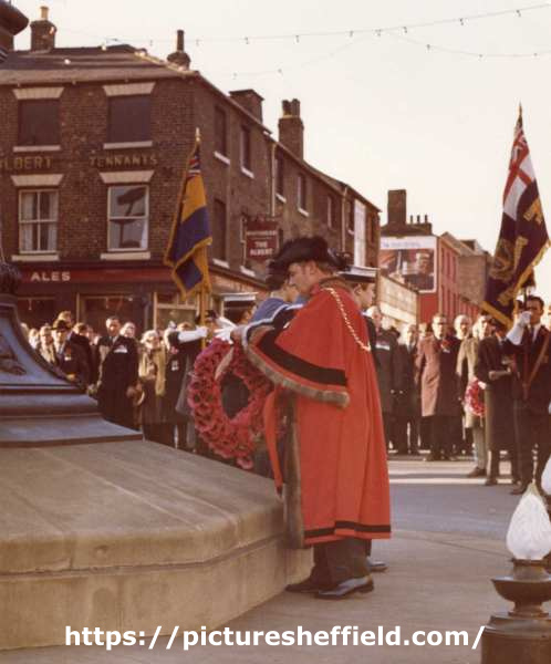 | Lord Mayor, Alderman Harold Hebblethwaite lays a wreath at the Armistice Day commemorations, Barkers Pool looking towards (centre) Division Street | |
