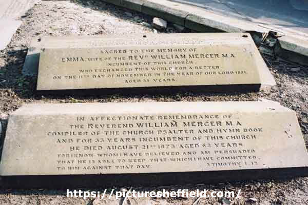 Gravestones read Sacred to the memory of Emma, wife of the Revd. William Mercer M.A. incumbent of this church who exchanged this world for a better life on the 11th day of November in the year of our lord 1851, aged 35 years. In affectionate rememberance of The Reverend William Mercer M.A. compiler of the church psalter and hymn book and for 33 years incumbent of this church. He died August 21st 1873, aged 62 years. For I know whom I have believed and am persuaded that he is able to keep that which I have committed to him against that day. 2 Timothy 1.12.