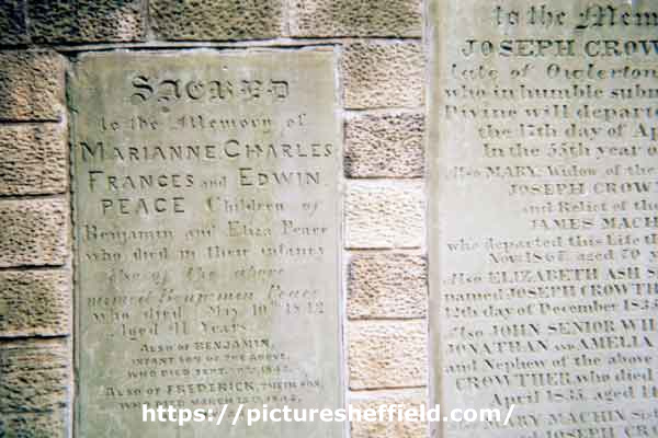 | Gravestone of the Peace family, Hillsborough Barracks. Gravestone transferred from St. Philip's C. of E. Church, Infirmary Road following the demolition of the church | |