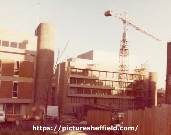 | Construction of Law Courts, Waingate from junction of Water Lane, Snig Hill and Castle Street showing (left) South Yorkshire Police Headquarters | |