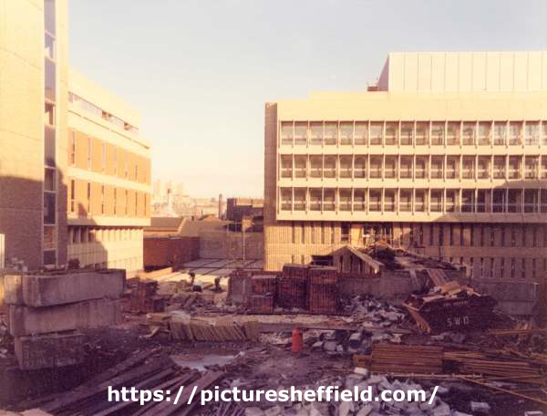| Construction of Law Courts, Waingate from junction of Water Lane, Snig Hill and Castle Street showing (left) South Yorkshire Police Headquarters | |