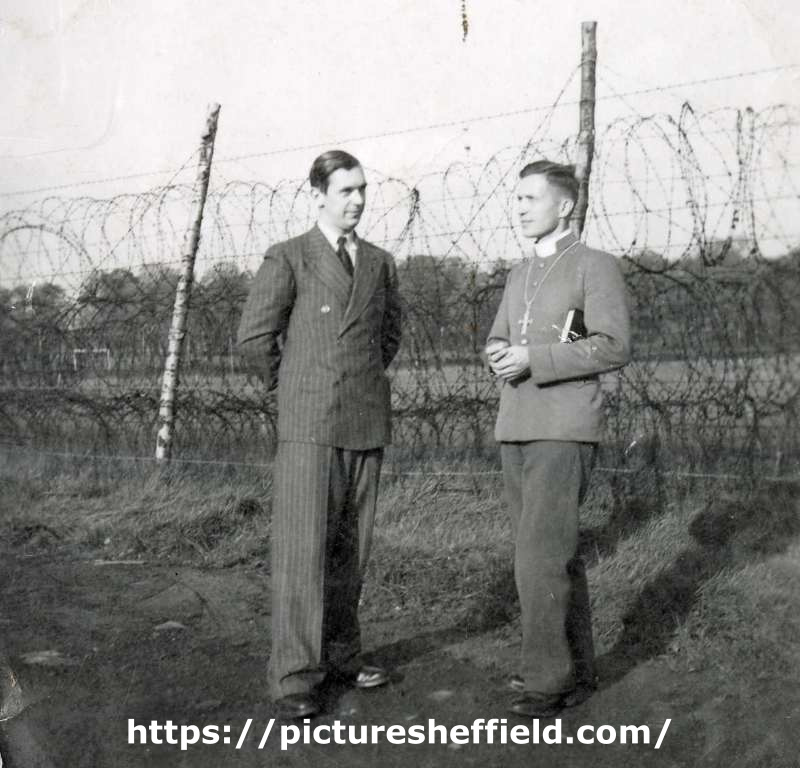 From a collection of photographs relating to Helmut Franke. Helmut Franke (born 1926) served in the German Luftwaffe during World War Two. On capture he was held as a Prisoner of War at various locations including Sheffield Camp No. 17 (as well as Norton Cuckney, Nottinghamshire and also near Newcastle, Bristol and Hull) between Mar 1945 and Jun 1947. The exact location of this photograph is not clear. Pictured are Ogren and Opf. Damrat. For papers relating to his internment and release, etc, see Sheffield Local Studies Library: MP 482 E. |