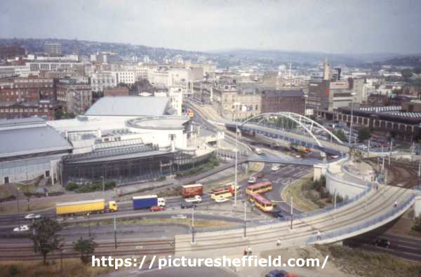 | Park Square roundabout showing (left) Ponds Forge Sports and Leisure Centre, (centre) Supertram Bridge and Commercial Street and (right) Sheaf Market | |