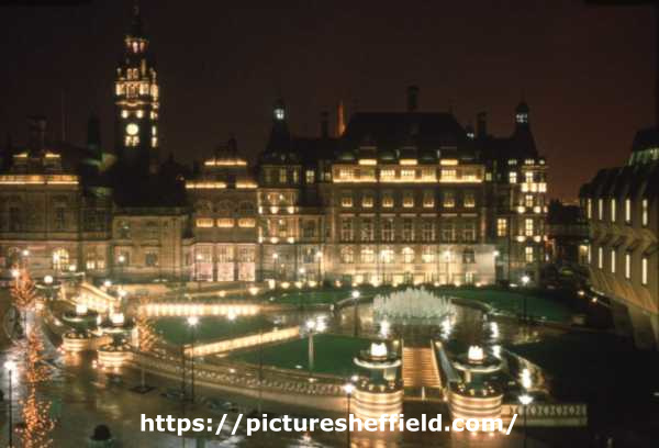 | Peace Gardens at night showing (back) Town Hall and (right) Town Hall Extension (also known as the Egg Box) | |