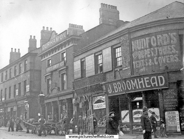 | Exchange Street from Furnival Road to Exchange Lane (foreground), 1913-1914, No. 57 John C. Broomhead, hairdresser, No. 55 J.H. Mudford and Sons, rope and twine manufacturers, Nos. 51 - 53 Durham Ox public house | |