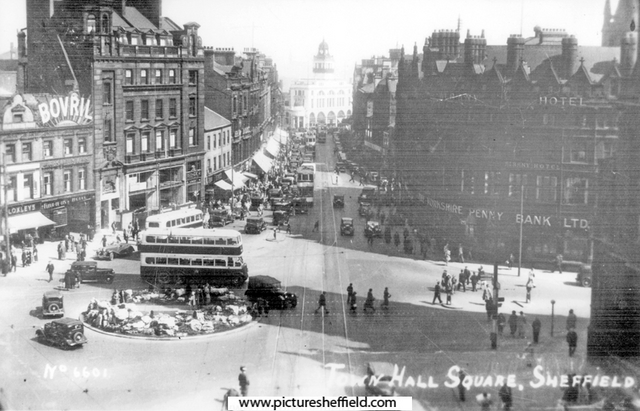 | Elevated view of Town Hall Square looking towards Fargate, Town Hall Square Rockery, foreground, No 66, Fleur de Lis public house and Bank Chambers, left, Albany Hotel and Yorkshire Penny Bank, right | |
