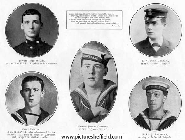 Pictured Top (l.to r.) Private John Willis (King's Own Yorkshire Light Infantry) and J. W. Jubb C.E.R.A. (HMS Saint George). Bottom (l.to r.) Cyril Dexter (King's Own Yorkshire Light Infantry), who volunteered for the Marines, took part in siege of Antwerp, and escaped in civilian clothes, Gunner Joseph Crapper (HMS Queen Mary) and Stoker J. Bradbury (Naval Brigade). Inscription at top of image reads Come hurtling, from the air or 'neath the wave, Darting, machines of death! come shot and shell!- Thy battle-signal flies from keel to keel. Nerving each breast for victory or the grave, Lest an insulting foe should toll our knell, And wrench the trident from our grasp of steel. A.G.M. Image from Sheffield Independent's War Album 'Our Boys at the Front', part 12 (Sheffield Local Studies Library: 940.5341 SST)