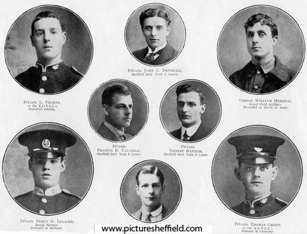 Pictured Top (l.to r.) Private L. Thorpe (King's Own Yorkshire Light Infantry) -reported missing, Private John G. Drinkall (Sheffield Battalion, York and Lancaster Regiment) and Gunner William Merrick (Royal Field Artillery) - wounded at Battle of Aisne. Middle: (l.to r.) Private Francis B. Vaughan and Private Ernest Banham (both Sheffield Battalion, York and Lancaster Regiment). Bottom (l.to r.) Private Percy G. Linacre (Royal Marines) interned in Holland, Private Clifford Hicks (Sheffield Battalion, York and Lancaster Regiment) and Private Thomas Green (King's Own Yorkshire Light Infantry) - prisoner in Germany. Image from Sheffield Independent's War Album 'Our Boys at the Front', part 12 (Sheffield Local Studies Library: 940.5341 SST) |
