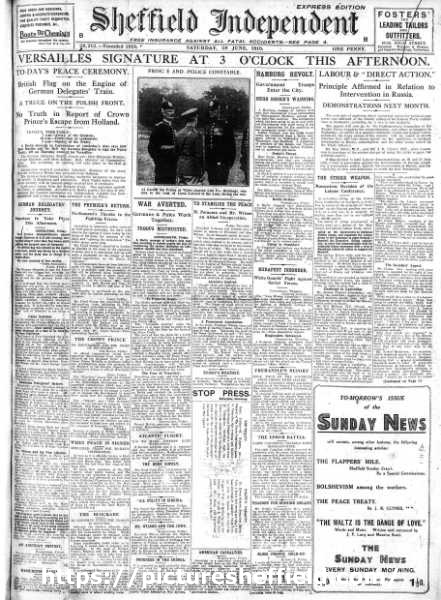 | Front page of the Sheffield Independent showing the headline for the signing of the treaty of Versailles, formally ending World War One | |