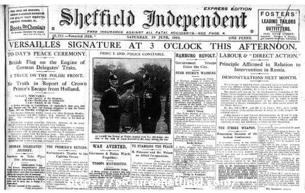 | Detail from Sheffield Independent showing the headline for the signing of the treaty of Versailles, formally ending World War One | |