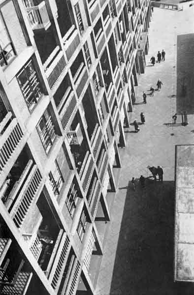 The Shopping Centre, named The Pavement, can be reached under cover along the decks. With the Meeting Hall, Public House and Coffee Bar nearby The Pavement is a meeting place for young and old. Access to the shops for service vehicles is by roadways at the rear. There is a lay-by for shoppers' cars at the Duke Street end of The Pavement.' Image from 'Park Hill Redevelopment Scheme' (Sheffield City Council, c. 1961) (Sheffield Local Studies Library: 331.833 SF) |