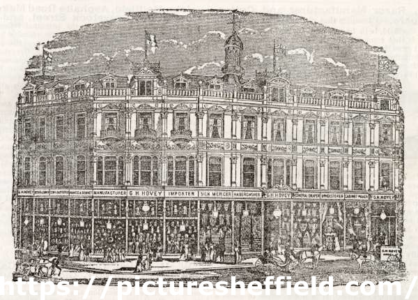 | G. H. Hovey and Sons, manufacturers and general warehousemen, general drapers, silk mercers, cabinet makers, upholsterers etc., corner of Angel Street and Castle Street | |
