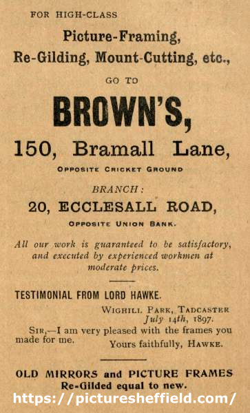 | Advertisement for Brown's, picture framers, No. 150 Bramall Lane | |