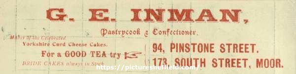 | Advertisement for G. E. Inman, pastrycook and confectioner, No.94 Pinstone Street and No. 173 South Street, Moor Sheffield Moor | |