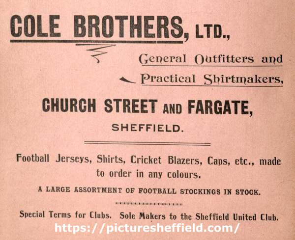 | Advertisement for Cole Brothers Ltd., general outfitters and practical shirtmakers, Church Street and Fargate | |
