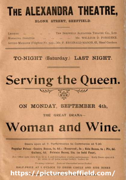 ![Advertisement for both the last night of 'Serving the Queen', [Saturday, 2nd September] and the drama 'Woman and Wine' at the Alexandra Theatre, Blonk Street, Monday, 4th September](https://www.picturesheffield.com/imagefiles/jpgl_sheffield3//y15104.jpg)