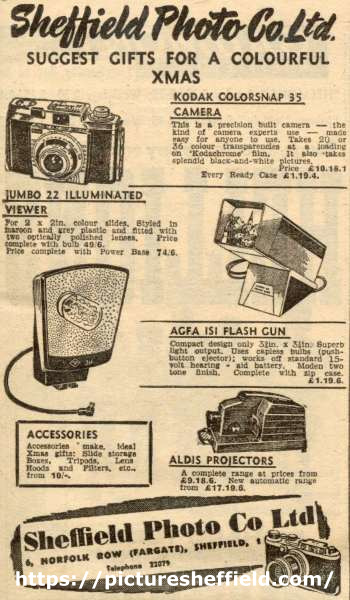 Caption reads Sheffield Photo. Co. Ltd., suggest gifts for a colourful Christmas. From the Star Lights Souvenir, 9 Dec 1961 (Sheffield Local Studies Library: MP 1580 L) |
