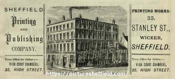 | Advertisement for the Sheffield Printing and Publishing Company, High Court Chambers, Nos. 35 High Street (orders) and No. 33 Stanley Street (printing works) | |