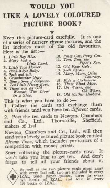 These picture cards, in a series of 18, given free with Izal products, could be exchanged for a book of nursery rhymes. Original at Sheffield Local Studies Library: MP 6055 S. |