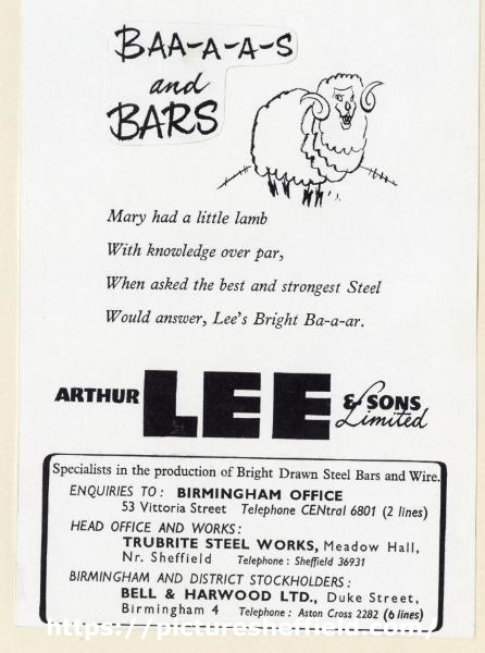 Original at Sheffield Local Studies Library: Arthur Lee and Sons, examples of advertisements 338.4 SSTF (207 014 022). |