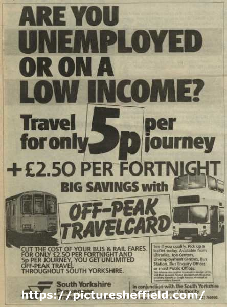 | Advertisement for the off peak travel card for the unemployed and people on a low income, South Yorkshire Passenger Transport Executive | |
