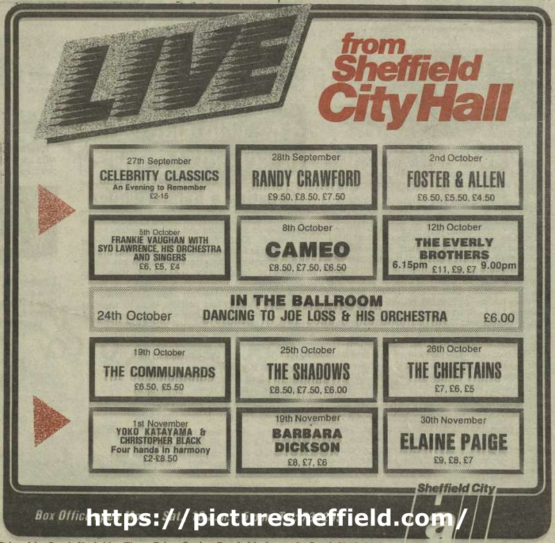 Includes reference to Celebrity Classics, Randy Crawford, Foster and Allen, Frankie Vaughan with Syd Lawrence, his orchestra and singers, Cameo, The Everly Brothers, Joe Loss and his Orchestra (Ballroom), The Communards, The Shadows, The Chieftains, Yoko Katayama and Christopher Black, Barbara Dickson, and Elaine Paige. From City of Sheffield News, Sep 1987 (page 8) (Sheffield Local Studies Library: 324.42 SF) |