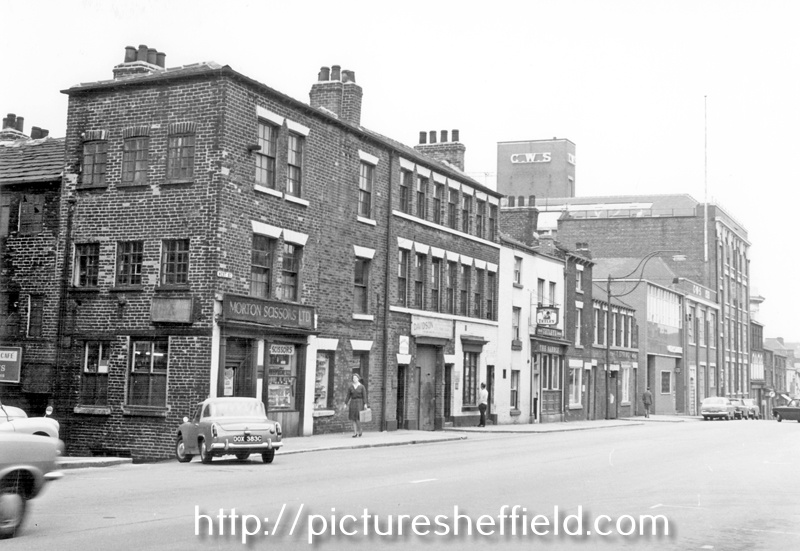 | Nos. 104 - 70 West Street from Bailey Lane junction. Premises include Nos. 100/104 Morton Scissors, scissors manufacturers, No 100, Davidson and Co. (Steel Stamps) Ltd., mark makers, No. 94 Saddle Inn, Nos. 70 - 82 Co-operative Wholesale Society Ltd. | |