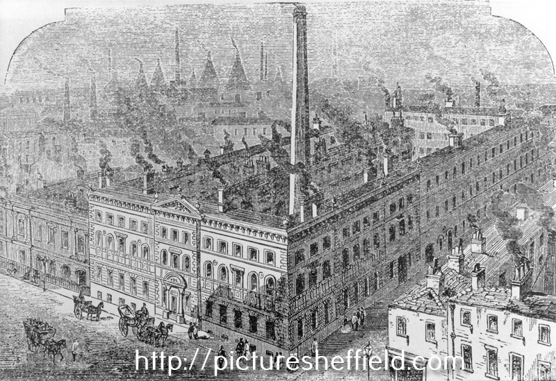 | Front view of Joseph Rodgers and Sons Ltd., Norfolk Works, cutlery manufacturers, No. 6 Norfolk Street, foreground, Milk Street, right | |
