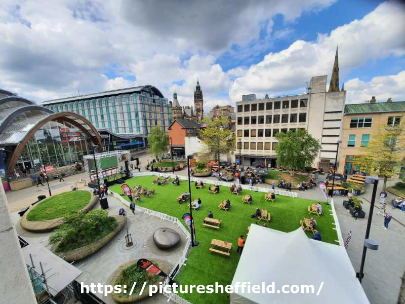 | Snooker Village during World Snooker Championships, Crucible Theatre, Tudor Square showing (left) Winter Garden, (centre) St Paul Mecure Hotel and (right) Head of Steam public house | |