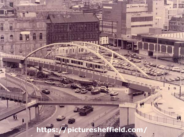 | South Yorkshire Passenger Transport Executive (SYPTE). Supertram on the Park Square supertram bridge showing (back right) Sheaf Market and Dunnes Stores and (left) Canada House (old Gas Company offices) | |