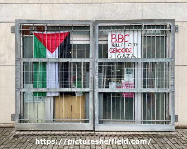 | ‘BBC Tell The Truth - Genocide in Gaza’ placard alongside Palestinian flag (positioned opposite BBC Radio Sheffield between Shoreham Street and Brown Street) | |