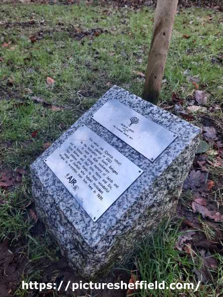 | Plaque next to tree in Endcliffe Park marking the 80th anniversary of the Association of Jewish Refugees | |