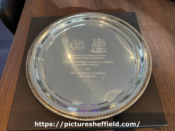 Inscription on silver plate reads Presented to the people of Bochum from the people of Sheffield by the right worshipful Lord Mayor of Sheffield, Councillor Colin Ross and the Lady Mayoress of Sheffield, Mrs Susan Ross. |
