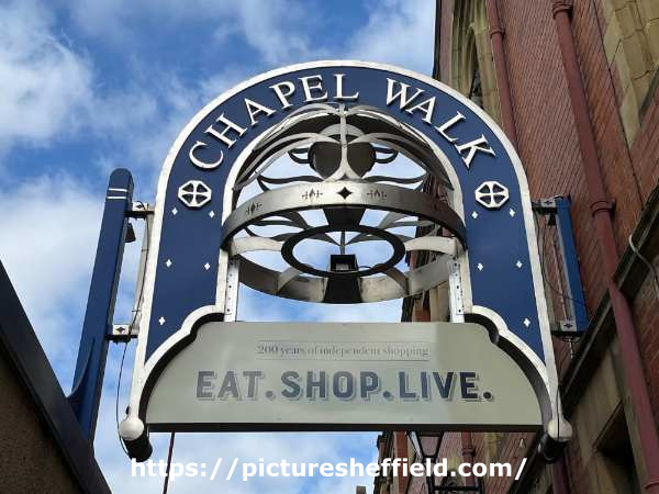 Street sign reads Chapel Walk. 200 years of independent shopping. Eat. Shop. Live. Image from Sheffield City Council's Bluesky account.<br /> |