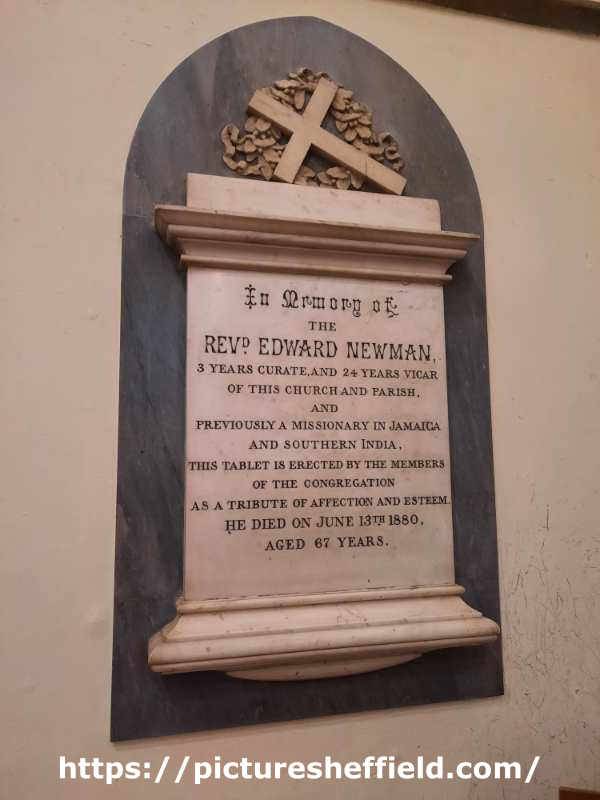 Memorial reads In memory of the Rev. Edward Newman, 3 years curate and 24 years vicar of this church and parish and previously a missionary in Jamaica and Southern India. This tablet is erected by mebers of the congregation as a tribute of affection and esteem. He died on June 13th 1880, aged 67 years. |