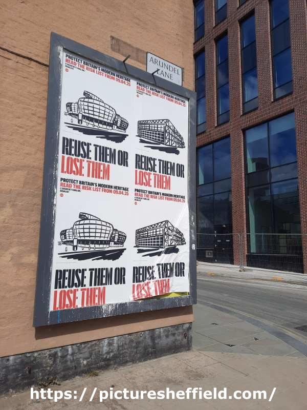 | Poster on Arundel Lane in support of The Hubs Building, Students Union (former National Centre for Popular Music), Sheffield Hallam University, Paternoster Row | |