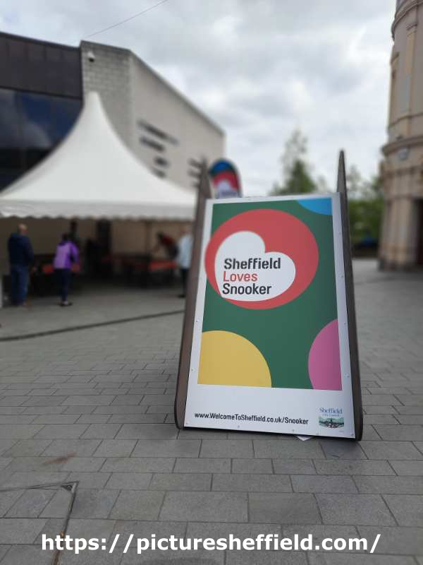 | Snooker billboard titled 'Sheffield loves Snooker' in the Snooker Village during the World Snooker Championships, Crucible Theatre, Tudor Square | |