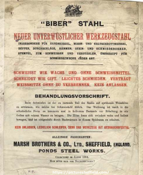 ![Braodsheet (in German) for Biber steel - new, indestructible tool steel - sole manufactuer: Marsh Brothers and Co. Ltd., [steel manufacturers], Ponds Steel Works, [Shude Lane], Sheffield](https://www.picturesheffield.com/imagefiles/jpgl_sheffield3//arc08058.jpg)