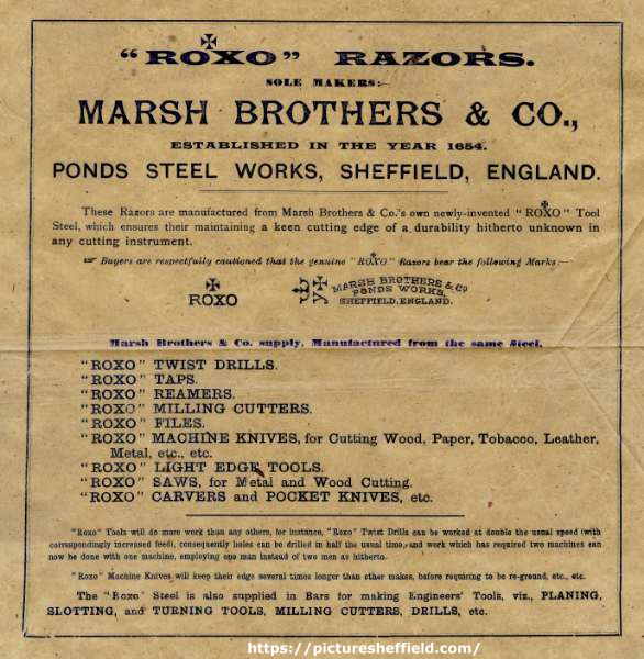 ![Label for Roxo razors, Marsh Brothers and Co. [Ltd., steel manufacturers], Ponds Steel Works, [Shude Lane], Sheffield, c.1905](https://www.picturesheffield.com/imagefiles/jpgl_sheffield3//arc08063.jpg)