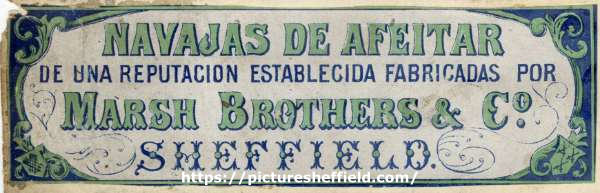 ![Label (in Spanish) for navajas de afeitar de una reputacion establecida fabricadas [fine razors], Marsh Brothers and Co.[ Ltd.], Ponds [Steel] Works, [Shude Lane], Sheffield](https://www.picturesheffield.com/imagefiles/jpgl_sheffield3//arc08148.jpg)